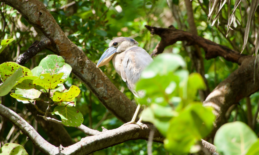 The Boat-billed Heron is the clearest example. This nocturnal species spends its days roosting in dense vegetation, tucked into exactly the kind of shadowy scrub that looks like nothing from a passing golf cart. Rochelle knew the roost site. Scanning into the branches revealed a small group of them hunkered in the canopy, wide bills and dark caps visible once you knew where to look. Without Rochelle, we would have rolled straight past.