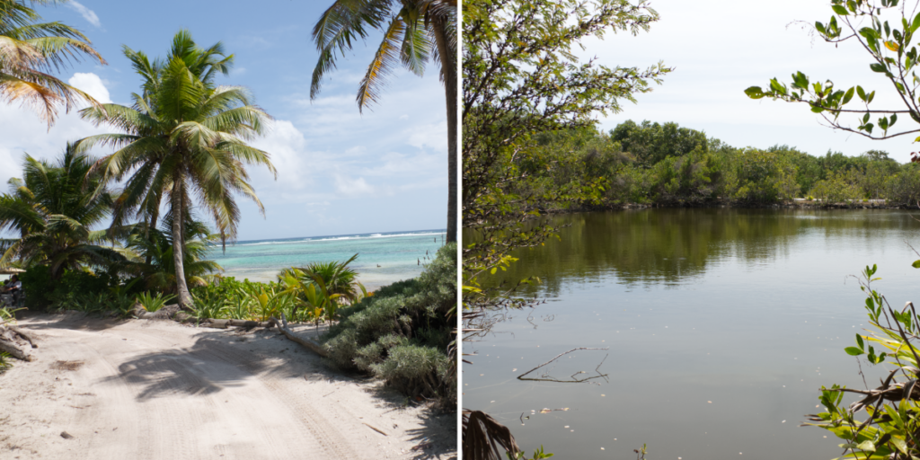 The route heads north from Belizean Shores, and as development thins out, the character of the island shifts noticeably. We moved through the area near Indigo, east of Secret Beach, continuing north past Costa Blu, Sapphire Beach, and up toward Reef Haven Resort and beyond Tranquility Bay. By the time we reached the more remote stretches, the surroundings were mangrove, the Caribbean Sea, and low coastal scrub. At points the track opens onto the Caribbean shoreline, palms framing a view of turquoise water and the distant white line of the barrier reef. At others it winds alongside still inland lagoons, mangrove closing in on all sides, and full of wading bird activity.